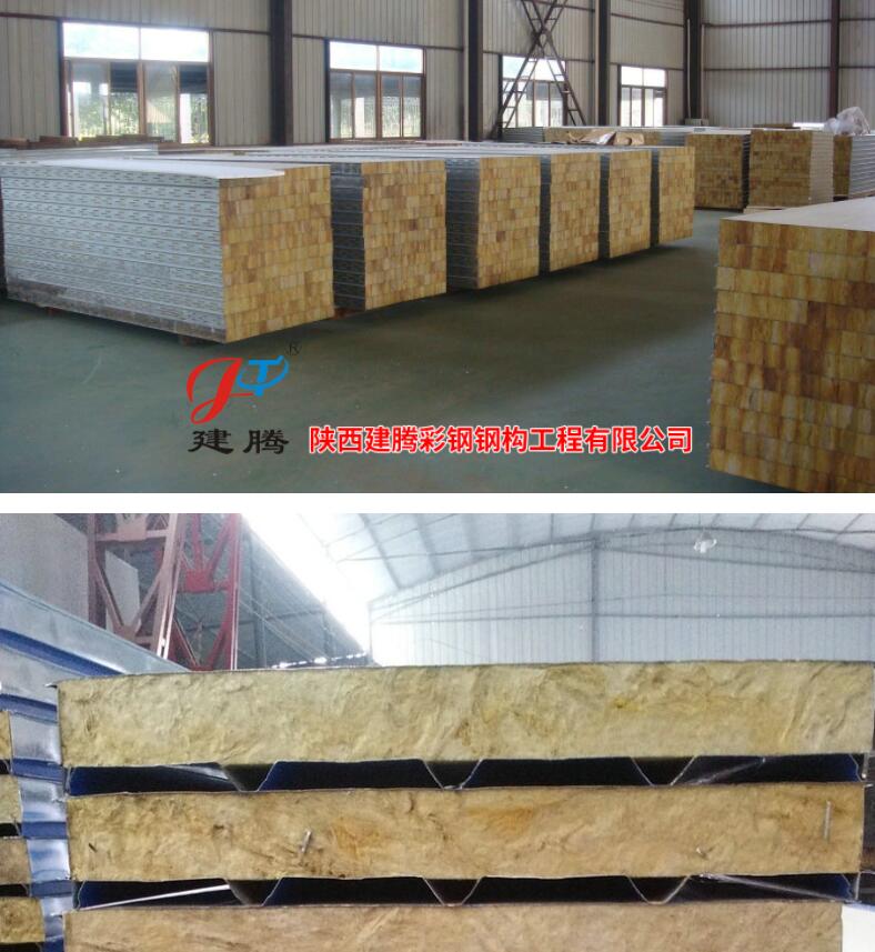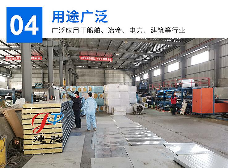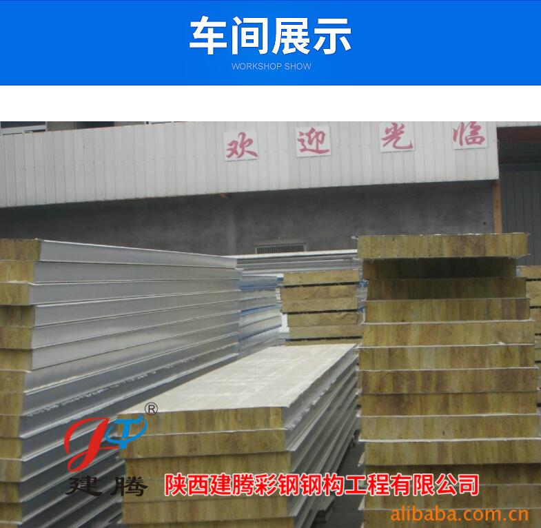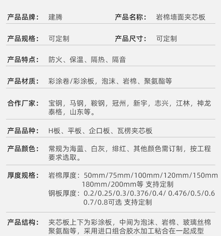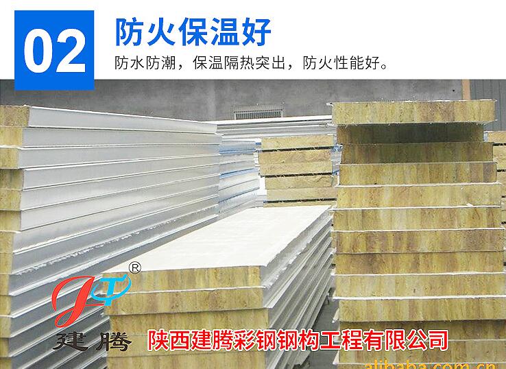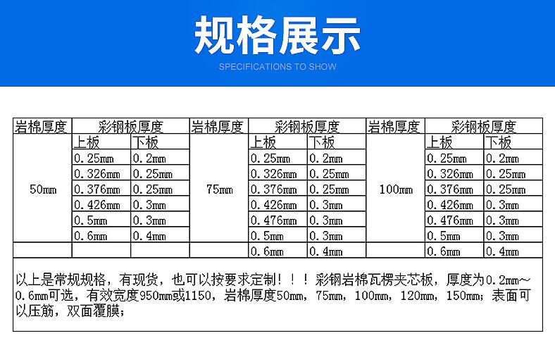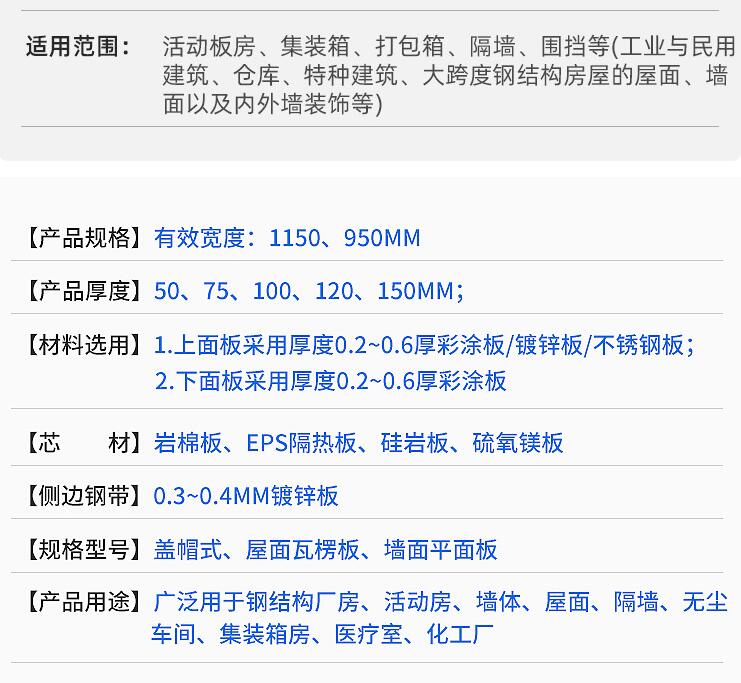 巖棉夾芯板 寬度<950mm1150mm,長(zhǎng)度160000mm可根據(jù)設(shè)計(jì)要求及運(yùn)輸安裝條件確定。 2)厚度:50mm 75mm 100mm 【面材】 上/下0.3~0.6mm彩色涂層鋼板(鍍鋅板、不銹鋼板、防靜彩色涂層鋼板)